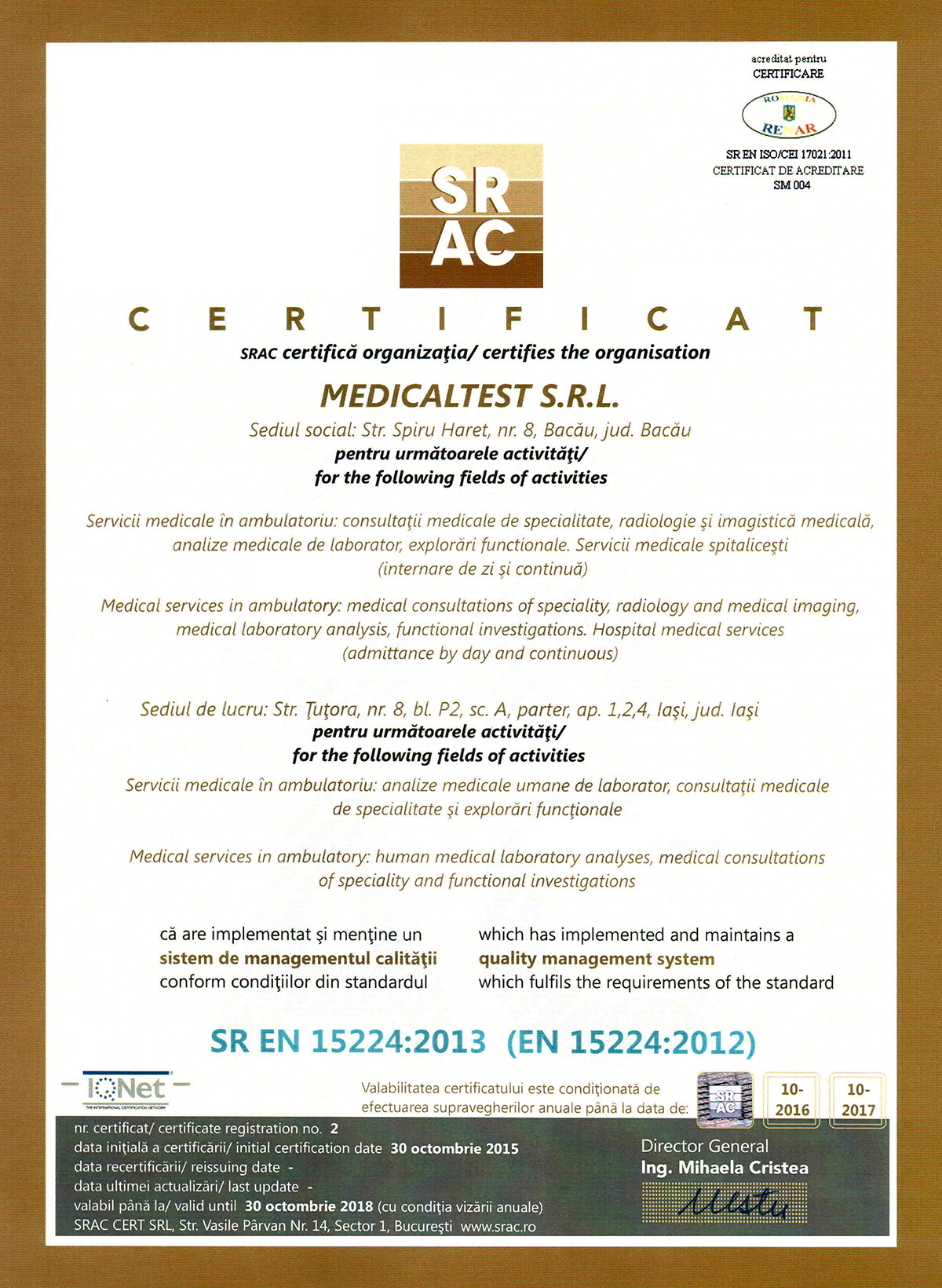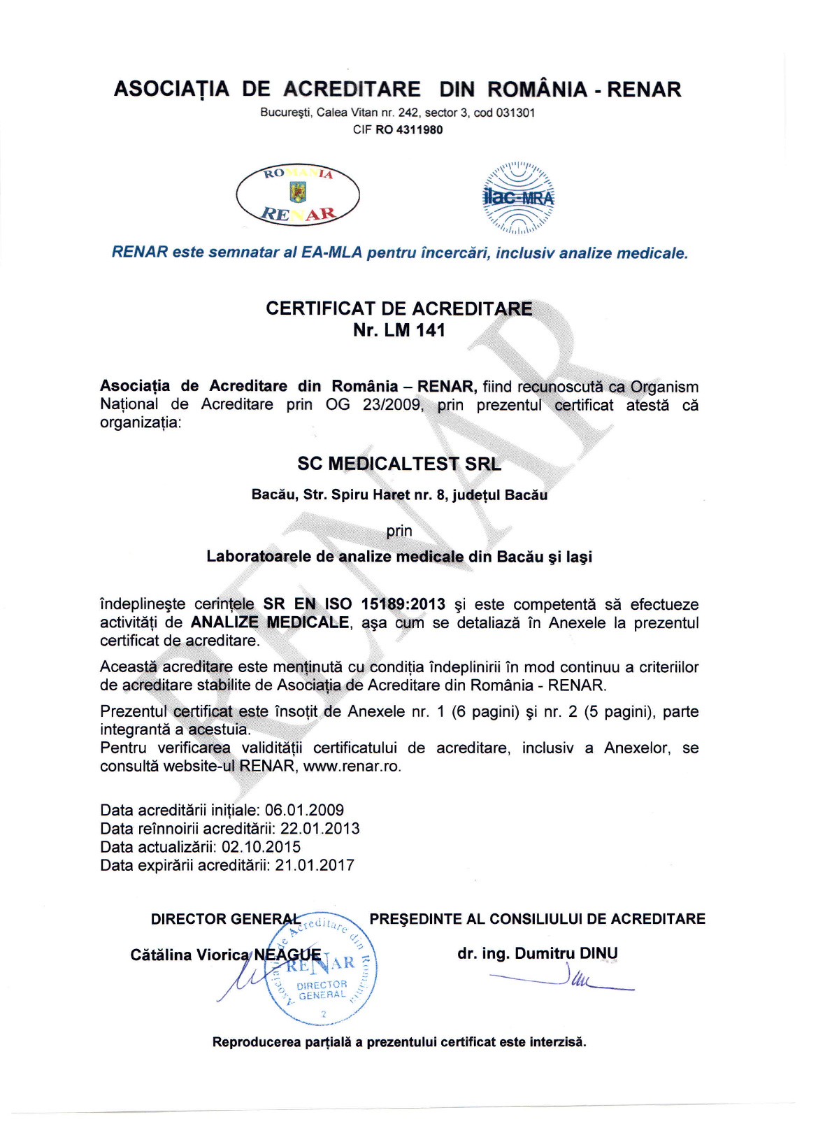 Calitatea, acurateţea şi precizia rezultatelor oferite de laboratoarele MEDICALTEST este certificată de Asociaţia de Acreditare din Romania – RENAR conform cerinţelor SR EN ISO 15189 : 2013.